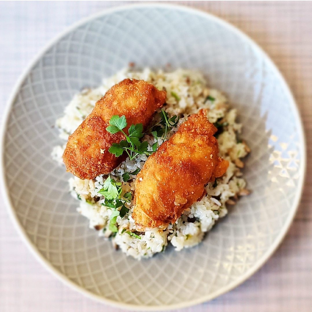 Sajttal sonkával töltött csirkemell rántva petrezselymes gombás jázmin rizzsel